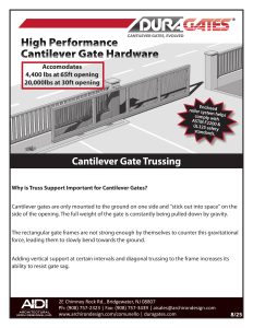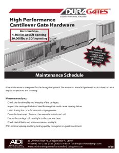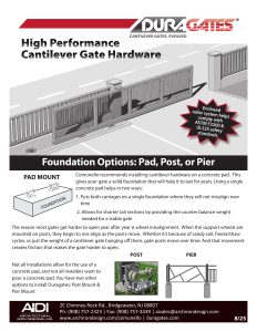 Comunello USA Catalog Duragates Product Manual Duragates Installation Instructions Tips and Tricks : Foundation Options: Pad, Post, or Pier Cantilever Gate Trussing Maintenance Schedule Sales Tip - Getting the accessories right