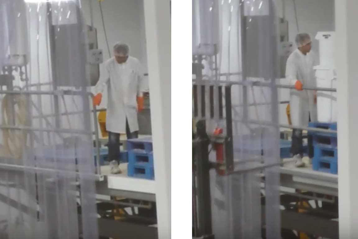 Lastly, this sliding gate acts as a safety gate for a food processing platform. The two carriages are mounted on steel plates to the left of the opening. When a forklift arrives to drop off supplies, the employee simply slides the gate to the left so the forklift driver can make his delivery.