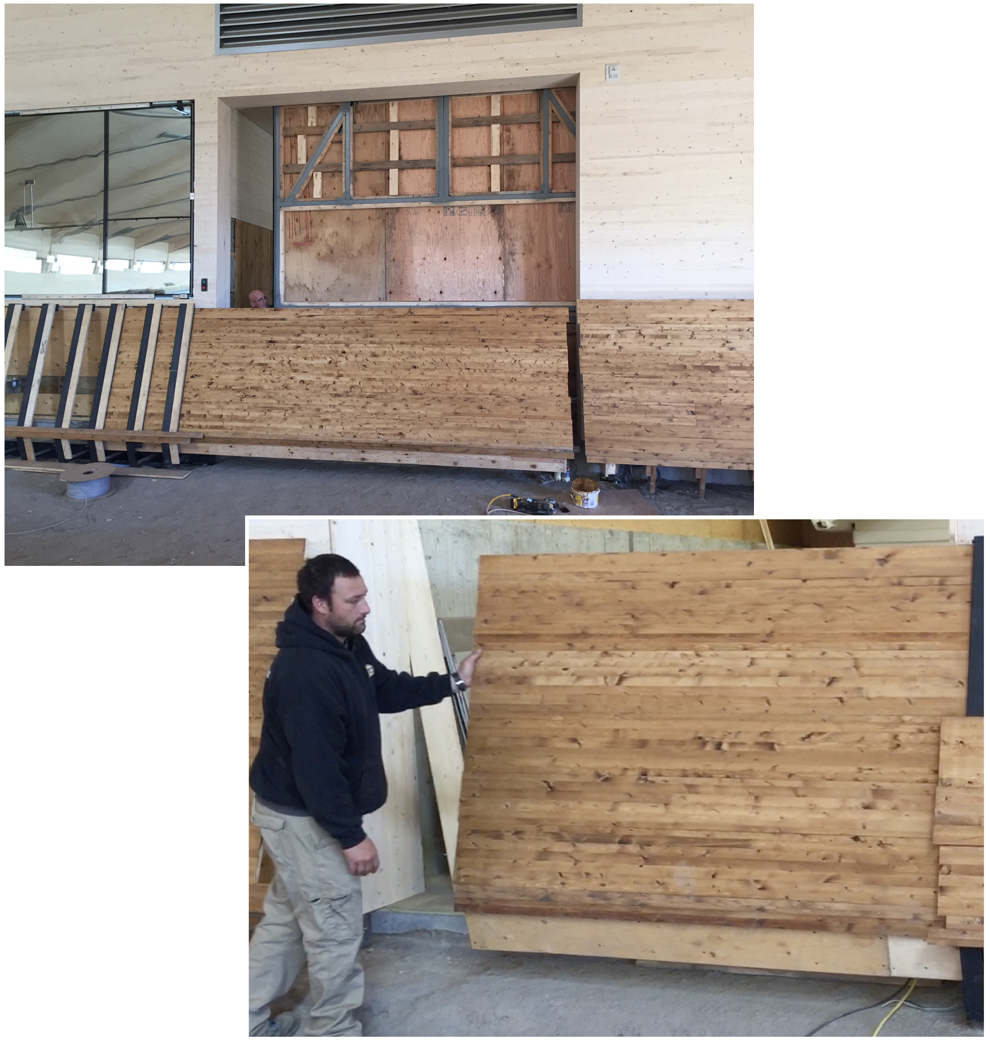 Can you spot the sliding gate/wall in this image? This solid wood, sliding barrier will be used as a wall to keep the horses within this new stable/riding area. Notice that there is no visible hardware. It’s been placed behind the wood walls to ensure the safety of the animals and their trainers.