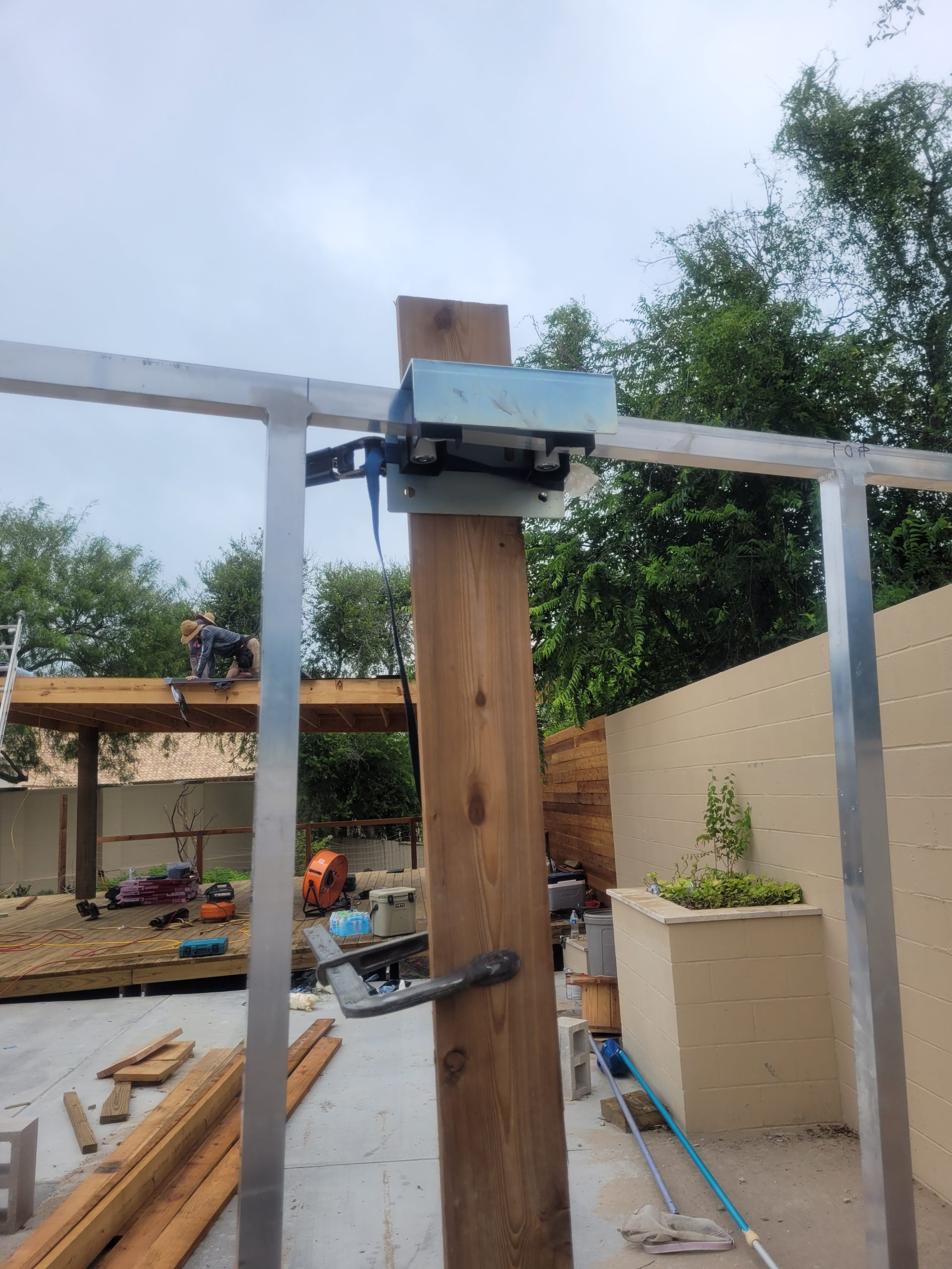 The CGA-350.5M cantilever gate for a patio enclosure combines functionality and modern design with safety in mind. Featuring horizontal wooden slats mounted on a sturdy metal frame, the gate glides smoothly on covered wheels, preventing pinch points while ensuring easy operation. Completely cantilevered off the ground, it avoids the need for a bottom track, making it low-maintenance and ideal for uneven surfaces. This design offers a clean, contemporary look while providing secure and reliable access to the outdoor space. From WRS Welding & Fabrication, Corpus Christi, TX “This is the gate I built and installed using your products. Everything was perfect, and great quality. I've already ordered parts for another gate from ya’ll!”