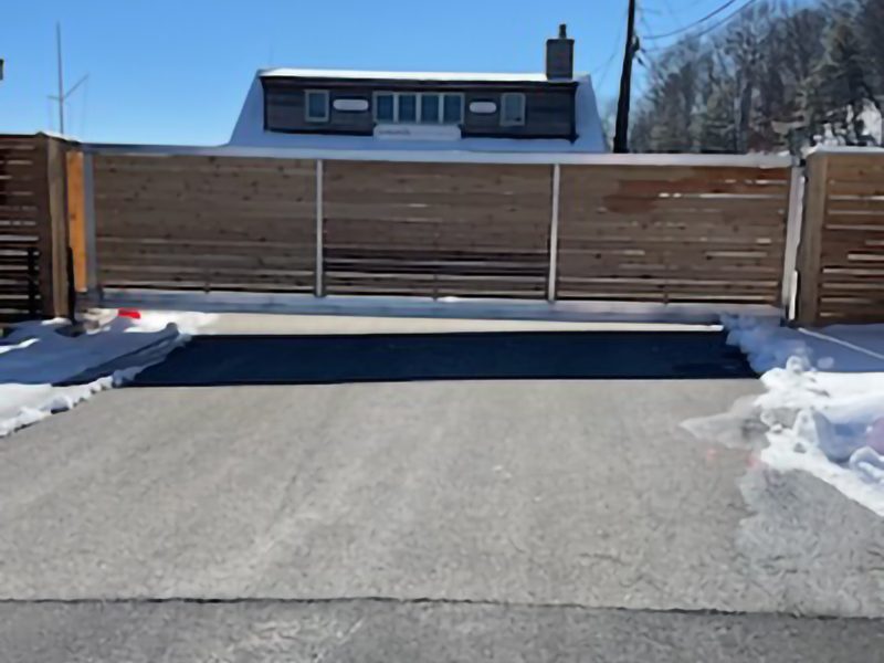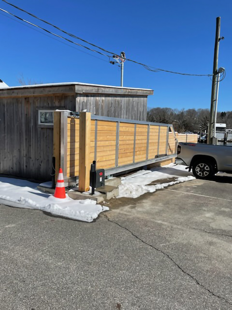 This cantilever sliding gate installation at Strong’s Yacht Center on Long Island features a 24-foot opening and a lightweight aluminum gate weighing approximately 500 pounds. The gate is supported by a DuraGates aluminum track system with CGA-350.5P carriages, providing smooth, ground-track-free operation that is ideal for snowy and marine environments. Designed to withstand coastal conditions, the horizontal slat infill helps reduce wind load while maintaining security and visibility. The cantilever design ensures reliable performance without obstruction across the driveway, making it a durable and low-maintenance access solution for a busy waterfront facility.